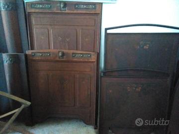 Testiera e pediera di 3 letti singoli ed 1 matrimoniale (formato da 2 singoli da unire), risalenti al '800 o al massimo primissimi '900. Totale 10 pezzi. Le reti le ho eliminate. Se si vogliono usare come letti, basta saldare ad una rete a doghe recente due anelli per parte (8 anelli per letto). Però si possono anche usare come pannelli divisori, separé, come ringhiere di protezione o frangivento oppure come pannelli di fondo per fioriere o per esposizioni d'arte, ecc. secondo la fantasia personale. Sono decorati da sembrare in legno e presentano delle decorazioni a mano con motivi floreali, con intarsi in madreperla ed elementi in altorilievo in bronzo che da soli portano un certo valore aggiunto intrinseco ed artistico. Posso valutare eventuali offerte. A disposizione per una visione diretta e per qualsiasi altra informazione.