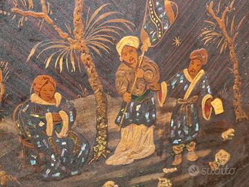 2 letti singoli in ferro battuto, metà dell 800 a detta dei miei trisnonni i quali li ricevettero come dono nuziale dal marchese o principe (Carrega) di Sala Baganza (Pr) dove la trisnonna lavorava. I letti ritraggono diverse scene di origine orientale impreziositi con intarsi in madreperla e altri inserti che rendono la texture in leqgero rilievo,non son mai stati restaurati, solo tamponati con olio paglierino.