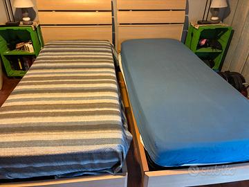 Vendo 2 letti singoli in legno con rete a doghe,materassi e testiera colore rovere chiaro. I letti possono essere usati separati oppure affiancati per formare un matrimoniale.