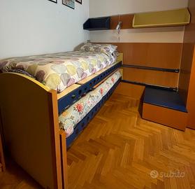 Vendo 2 letti per bambini/ragazzi sovrapponibili e scorrevoli su boiserie comprensivi di pianale in legno, 2 mensole su boiserie e al di sotto del letto superiore 1 scrivania estraibile.