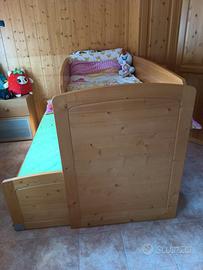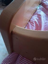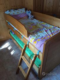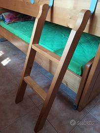 Vendo letti in legno massello color miele, 1 piazza ciascuno, completi di rete e materasso. Ottimo stato. Letto inferiore con ruote bloccabili, letto superiore con barre di protezione. Scaletta in legno massello originale. Vendita rivolta a chi è disposto a ritirare di persona.