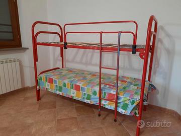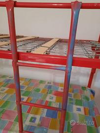 Struttura in metallo di una coppia di Letti singoli a castello in metallo rosso e colpi di spray grigio, vintage, con reti come da foto.