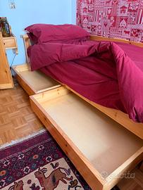Un letto con due cassettoni sotto e l’altro con ulteriore letto singolo estraibile, totale 3 posti letto.