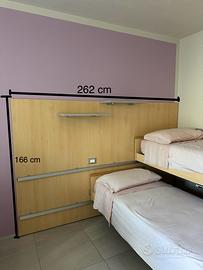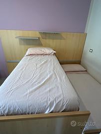 Vendita di una struttura formata da due letti in legno, facilmente scorrevoli, comodi per pulizie e salva spazio grazie alla sovrapposizione dei due, scaletta in ferro per il letto superiore, due mensole.