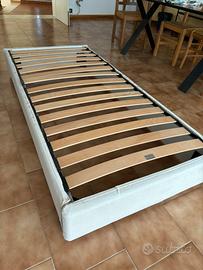 2 letti singoli con sponde imbottite con stoffa sfoderabile, rete a doghe in legno. Misure 190x90 cm