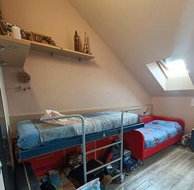 Struttura composta da letto a pavimento dotato di rotelle e rivestimento rosso in stoffa (appena rigenerato in tintoria) e letto soprastante a scorrimento con scaletta centrale e guida a parete (lunghezza parete necessaria min 410cm).