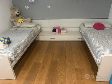 Lettini singoli scorrevoli cameretta. Boiserie e cassetiera come testata. Colre bianco/grigio. Materassi singoli inclusi. I letti scorrono e possono essere usati come singoli o uniti come matrimoniale