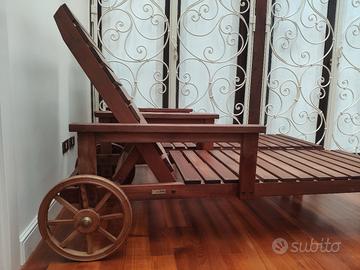Due lettini prendisole in legno di marca Unopiú con ruote. Compresi di cuscini con fodere originali Unopiú più ulteriore copertura di tessuto scozzese