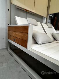 I pannelli laterali, realizzati in teak, si trasformano facilmente in pratici tavolini d'appoggio grazie a una maniglia in acciaio spazzolato. L'apertura dei ripiani è agevolata da un ammortizzatore pneumatico, che ne facilita l'uso.