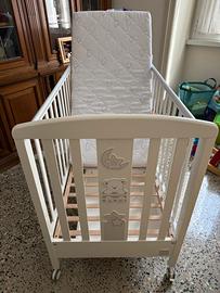 Lettino con struttura in legno verniciato bianco. Decoro su pediera. Una spondina abbassabile. Rete a doghe e cassetto inferiore a doppio scompartimento. Dotato di 4 ruote piroettanti di cui 2 con freno. Usato molto poco (in casa secondaria) e ben conservato. In vendita insieme a materasso 60cm x 120cm Traumland, senza macchie (utilizzato esclusivamente con coprimaterasso impermeabile).