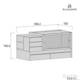 Vendo lettino trasformabile ALONDRA modulabile in base alla crescita del bambino: Fase1: Nello stesso mobile avrete il lettino 70×140 cm, una cassettiera con 3 cassetti e na zona fasciatoio nella parte superiore, un book libreria con 2 grandi scompartimenti e nella parte inferiore, 2 cassettoni o un letto a rotelle tra cui scegliere.