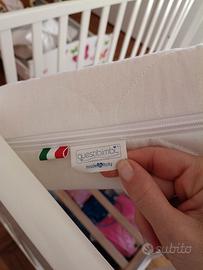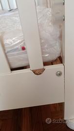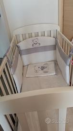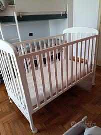 Lettino con sbarre di protezione fisse, misura esterna del letto è 130x72, completo di materasso, paracolpi e sacco del piumone in ottimo stato; presenti 2 cassetti posti sotto il lettino. Unico difetto unica traversa rotta (vedi foto)