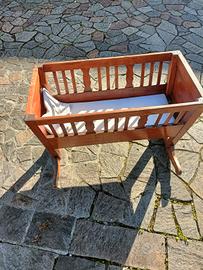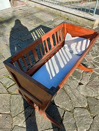 Culla a dondolo vintage, in legno, fatta interamente a mano. Completa di materassino, sotto testa e piumino.