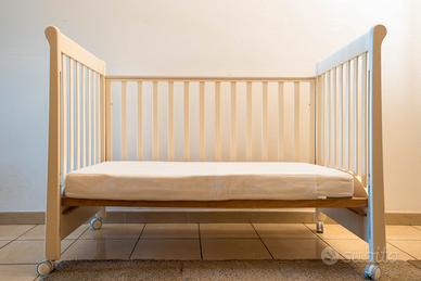 Il lettino è realizzato in legno di faggio, dotato di ampio cassettone, kit doppia altezza e rete ortopedica con doghe in legno. Dispone inoltre di due sponde mobili, con possibilità di rendere una fissa, senza cassetto.