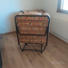 Lettino da campeggio pieghevole, mai usato. Ha anche le ruote, quindi si sposta facilmente. È pieghevole e, come da foto, ha la sua fodera in stoffa per quando viene riposto.
