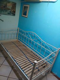 Divanetto/letto singolo in ferro battuto, colore bianco panna, rete a doghe, senza materasso