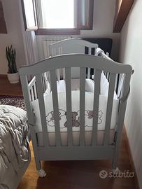 Il lettino è compreso di materasso, paracolpi coperta e federa per cuscino. Ha sponde regolabili e cassettiera sottostante.