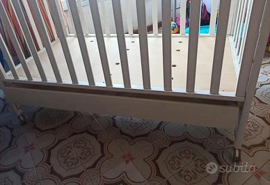 Lettino Foppapedretti con sponda regolabile e a scomparsa posizionabile a destra o a sinistra, trasformabile in divanetto. Dotato di 4 ruote piroettanti di cui 2 con freno e di ampio cassetto. Struttura in legno massiccio di faggio verniciato con colori atossici.