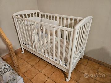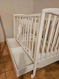 Lettino Foppapedretti con Sponda Regolabile Lucy, Legno di Faggio, Made in Italy, Rete a Doghe di Faggio, Ampio Cassetto, Regolabile a Doppia Altezza, 4 ruote. Compreso di materasso anallergico,paracolpi, piumino e lenzuola. Prezzo non trattabile. Trasporto a carico dell'acquirente.