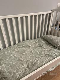 Lettino bianco con rete a doghe munito di 4 sponde mod. Lucy Foppapedretti, 4 ruote piroettanti di cui 2 frenanti più materasso Foppapedretti. Misura: H103 x P71 x L131 cm