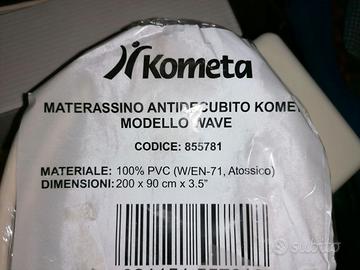 Compressore Kometa ME 700 con regolatore di pressione - Tensione e frequenza: AC 220- 230 V / 50 Hz. Potenza assorbita : < 10W Aria in uscita: 6 lt/min. Range di pressione: 40-110 mm/Hg Materasso a bolle d’aria “modello Wave” Ciclo: 5 min. con materasso Komet Press ”Bubble”, 10 minuti con materasso “Wave” o ME 600 Materiale : Polivinilcloruro (PVC medicale) termosaldato, con trattamento antibatterico ATOSSICO - Peso apparecchio: Kg 1,2 Rumorosità: < 35 dB Cavo di alimentazione: si (3 m) Dimensioni: cm 10,5 X 22,5 X 10 Peso: kg 1,2 - - - Dimensioni: 200x90x9 cm. (gonfiato) N. elementi: 14 Peso: Kg 2 Portata massima: Kg 130
