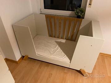 Insieme al letto vendiamo il relativo materasso con doppia facciata, una per neonato e una per bambino, anch’esso acquistato in Germania su Amazon.