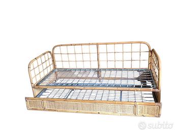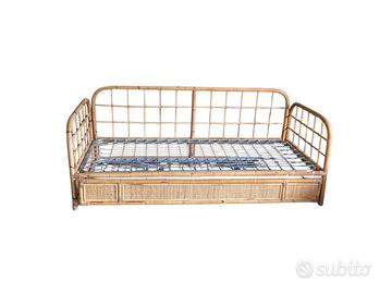 Elegante lettino in rattan naturale intrecciato, dal design solido ma visivamente leggero e arioso, perfetto per arredare ambienti in stile boho, vintage o coloniale.