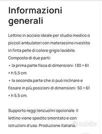 Come da descrizione e foto vendo lettino pee ambulatorio medico in eprfette condizioni , amcora imballati da carta trasparente , allego caratteristiche azienda e relative misure , compreso portalenzuolino di carta . Da listino 210€ piu iva