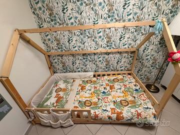 Lettino capanna in legno per bambini 90x190cm. Molto sicuro e può essere arricchito con stoffe, lucine, altri festoni, che piacciono molto ai bambini. Max peso 110 kg.