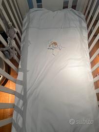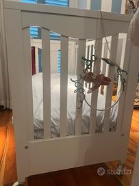 Vendo quasi nuovo, Mai Usato, lettino Nanan in legno laccato con vernice atossica a base di acqua di colore bianco, nel rispetto delle norme europee. Ogni componente del lettino è all'insegna della totale sicurezza e comodità del bebè, e le stecche sono posizionate in modo da evitare qualsiasi pericolo.Il lettino è fornito di materasso, piumino e copripiumino colore celeste chiaro modello Puccio..Dimensioni: 131×71×112cm
