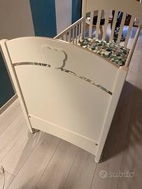 Lettino Alice in legno bianco con spondina regolabile, rete a doghe, cassetto estraibile e 4 ruote piroettanti (2 con freno). Incluso materassino e copri materasso con cuscino e lenzuola. Ottimo stato un affare trattabile!