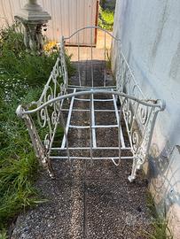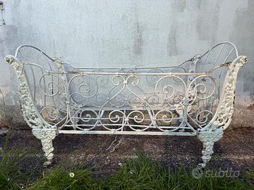 lettino o culla in ferro battuto, caratterizzato da lavorazioni decorative a volute e dettagli floreali. Originariamente concepito come lettino per bambini o bambole, oggi spesso utilizzato come elemento decorativo d'arredo
