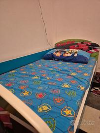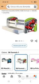 Letto da bambino 160x80, con cassettone contenitore e materasso, usato pochissimo. Presente decalcomania della Formula1 con il nome FACILMENTE RIMOVIBILE. È completo anche della spondina come nella foto presente sul sito del fornitore
