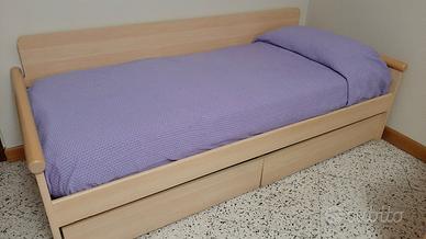 Lettino per una stanzetta sia per bambini che per adulti. Color frassino e con i braccioli i legno massello. È dotato di due cassettoni estraibili molto capienti. Si vende senza il materasso.