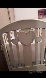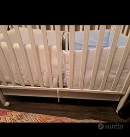 Vendo lettino Picci in legno di colore bianco atossico con materasso e corredo completo di piumone, coperte, lenzuola e paracolpi.