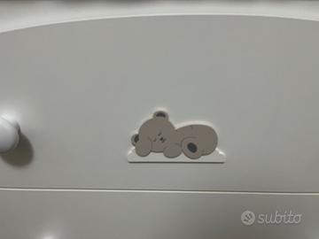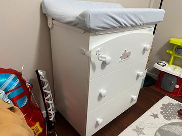 Fasciatoio con vaschetta per bagnetto estraibile, tre ampi cassetti, ruote rimovibili (cuscino per cambio pannolino da sostituire).