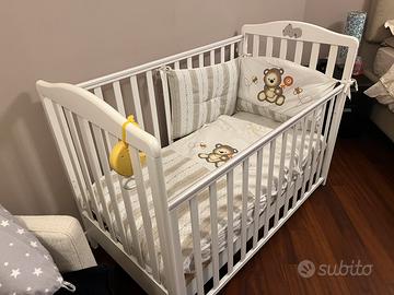 Lettino con sponde regolabili, imbottitura perimetrale, rete regolabile, cassettone, piumino con copri piumino., ruote rimovibili.