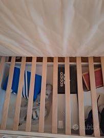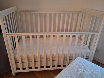 Lettino bianco semplice senza decori marca italbaby con sbarre abbassabili, doghe in legno, cassetto diviso in 2, materasso spesso e resistente,