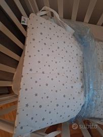 corredato da paracolpi reversibile con stelline bianco e grigio, piumino leggero, copripiumino e federa della stessa fantasia del paracolpi.
