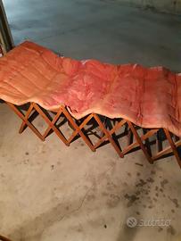 Sdraio/lettino richiudibile in legno e tessuto., anni 60, adatto come oggetto modernariato per esterni e interni. Da restaurare rinnovando l'imbottitura e il tessuto e consolidando la struttura. Pezzo unico introvabile dal baule della nonna. le dimensioni da chiuso cm 90 lungo 60 altezza e 40 largo .