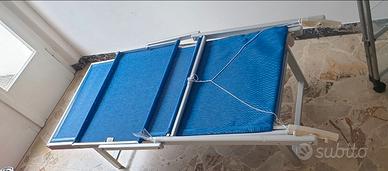 Vendo questo lettino sdraio materiale alluminio tenuto molto bene e non ha punti di ruggine, unica cosa la cordina manca perche con il tempo si è spezzata ma in ogni caso funziona tutto perfettamente ed è reclinabile in 3 posizioni con il suo bloccaggio che funziona perfettamente. Vendo per inutilizzo a persone realmente interessate prezzo poco trattabile