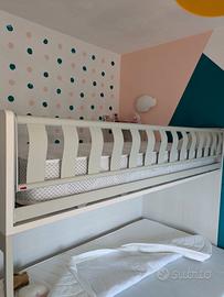 Vendo lettino a soppalco come nuovo della cameretta dei bambini. Marca Moretti compact. Completo di materasso lettino singolo. Comodi cassetti sulla scaletta e ampio cassettone contenitore sul fondo come si vede in foto. Doghe in legno sotto materasso. Non vendo il letto sotto che si vede in foto. È tutto come nuovo senza un graffio e senza nessun segno di usura. Perfetto in ogni sua parte. Possibilità di visionare. Non spedisco.