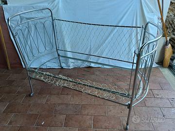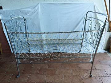 Vendo lettino per bambino /bambina in acciaio e corda anni '60 con 4 ruote, vintage.