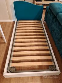 letto 1 piazza, 100x200 con testa in legno color petrolio, possibilità di rialzare coi 4 piedini petrolio compresi. ottime finiture del legno e ottima qualità delle doghe. usato ma in ottime condizioni
