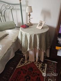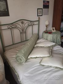 Elegante letto in ferro battuto da una piazza e mezza color salvia, comprensivo di materasso pari al nuovo, copriletto, copripiumino, cuscini e rollone, rivestiti in tessuto pregiato con passamaneria fiorentina. Misure: 126x209