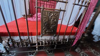 Bellissimo letto a baldacchino '800 in ottone lavorato, completo di fregio, corona sommitale e tappezzeria, in ottime condizioni generali, ideale per arredare dimore di pregio.