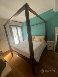 Letto a baldacchino mis 180x210 in legno con doghe in legno incastonate e rimovibili singolarmente. Solo ritiro a mano no consegna . No perditempo .