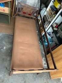 Letto a barca trasformabile in divano da rifoderare con due sedie abbinate , legno intagliato a mano , una sedia antica il resto produzione artigianale anni 50. Non spedisco .