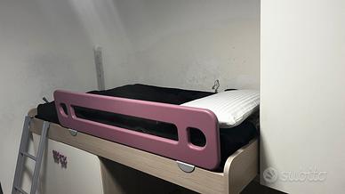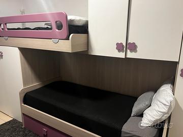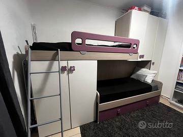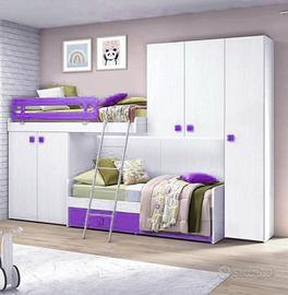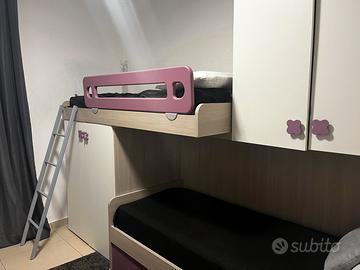 Il soppalco salva spazio è composto da 3 letti, di cui uno estraibile e un'altro a ponte( senza materassi ) ,un armadio con 1 anta lunga e 2 ante stagionali.