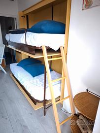 Vendo per inutilizzo, usato ma in perfette condizioni ( senza materassi) letto a castello in legno a scomparsa, possibilità di essere aperto anche singolarmente, compreso di barra laterale di sicurezza e scaletta in legno, prezzo leggermente trattabile